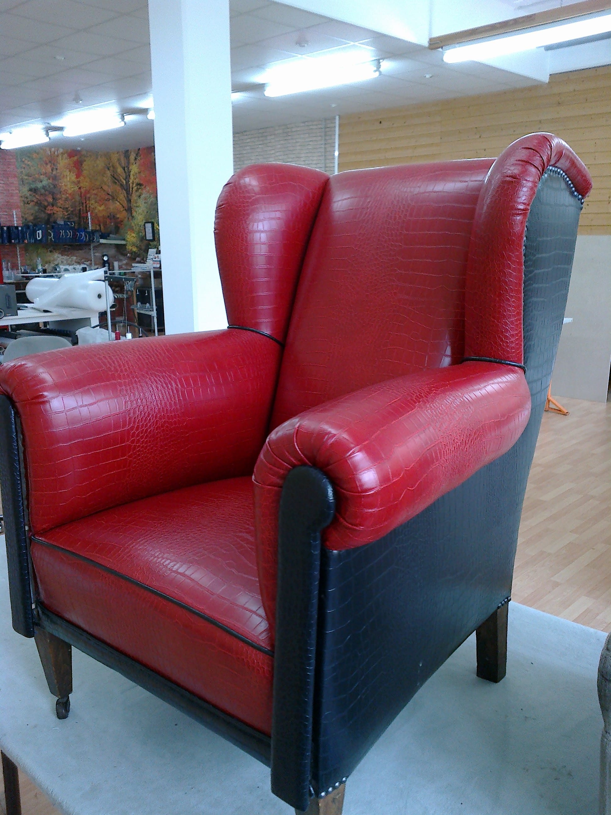 Komplette Umgestaltung, Gestell neu lackiert, Sitz mit Federkern und Rückenpolster mit Schaumstoff neu aufgebaut, Bezug rot gefärbtes Kuhfell